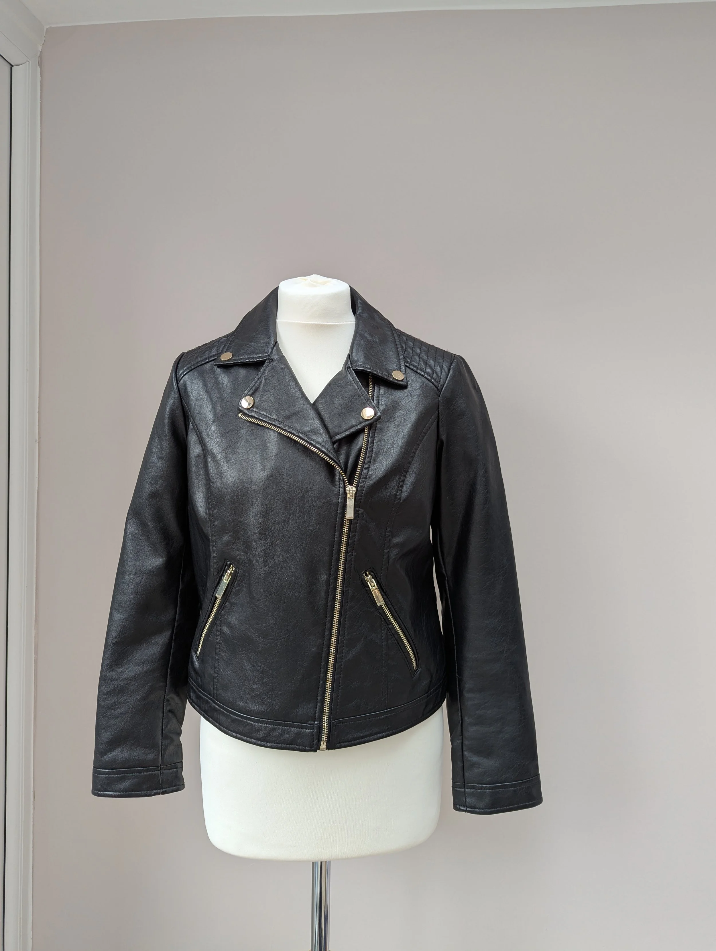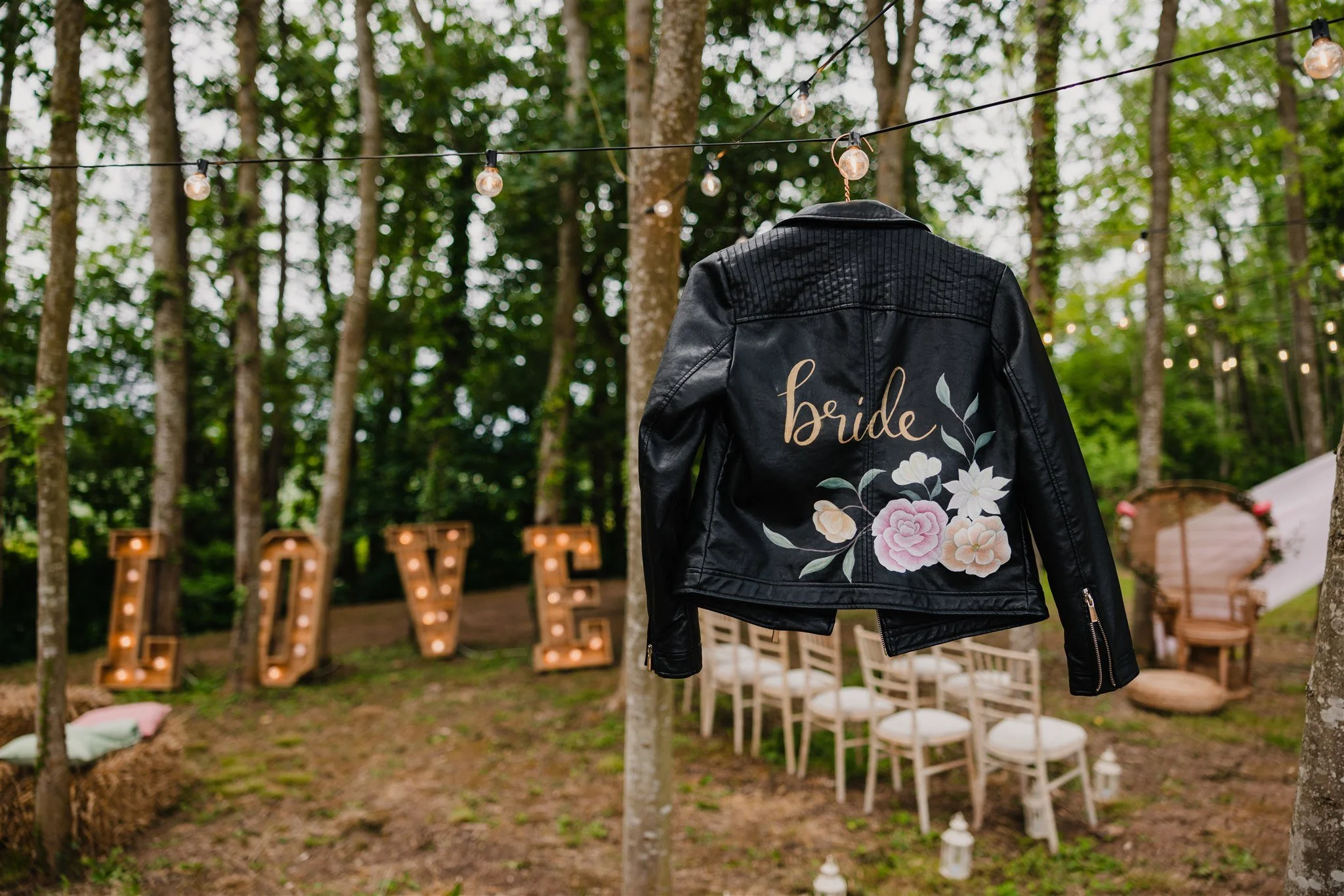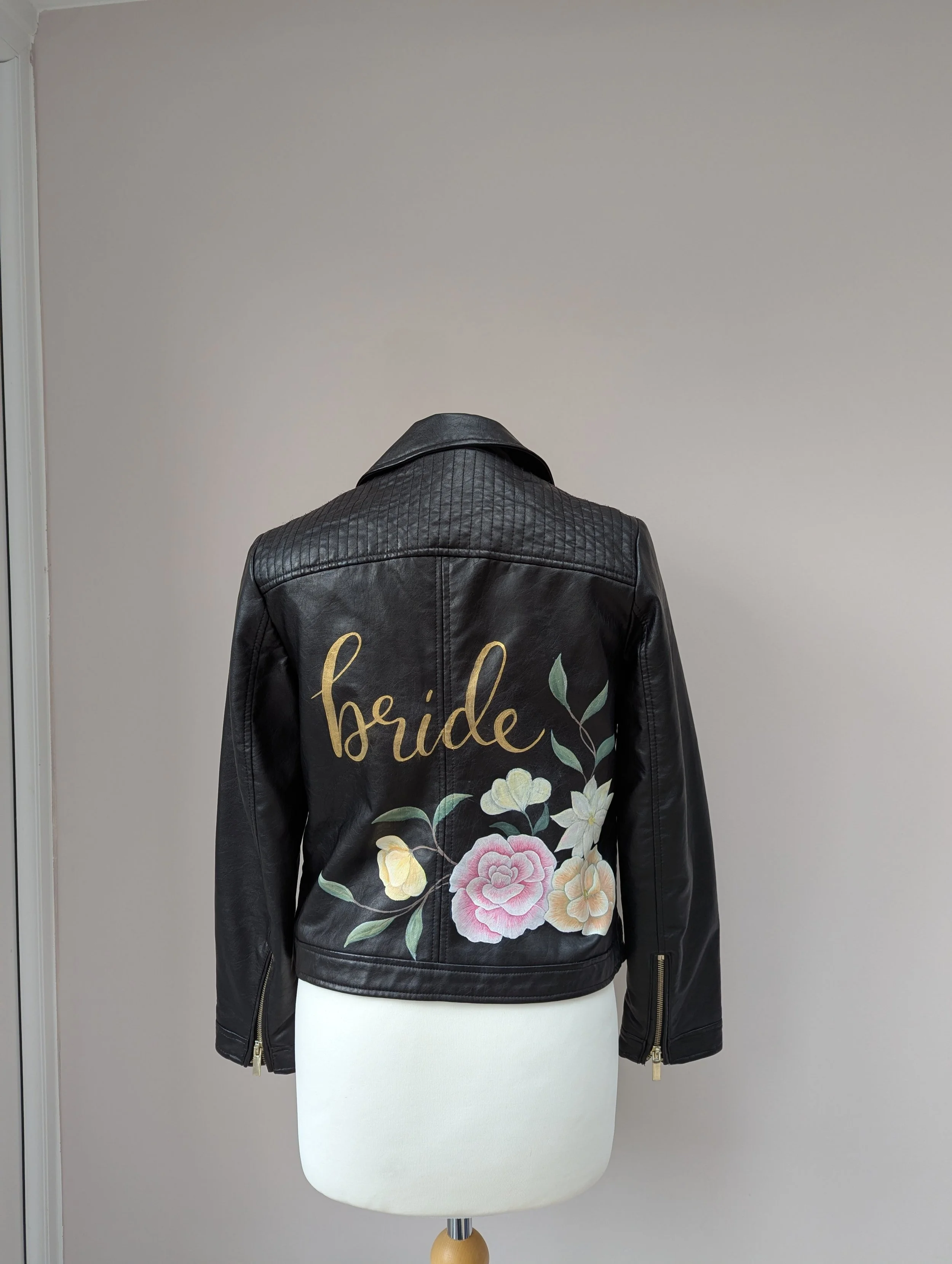 Add a touch of whimsy to your wedding day with this floral bride a one-of-a-kind hand-painted black faux leather jacket.