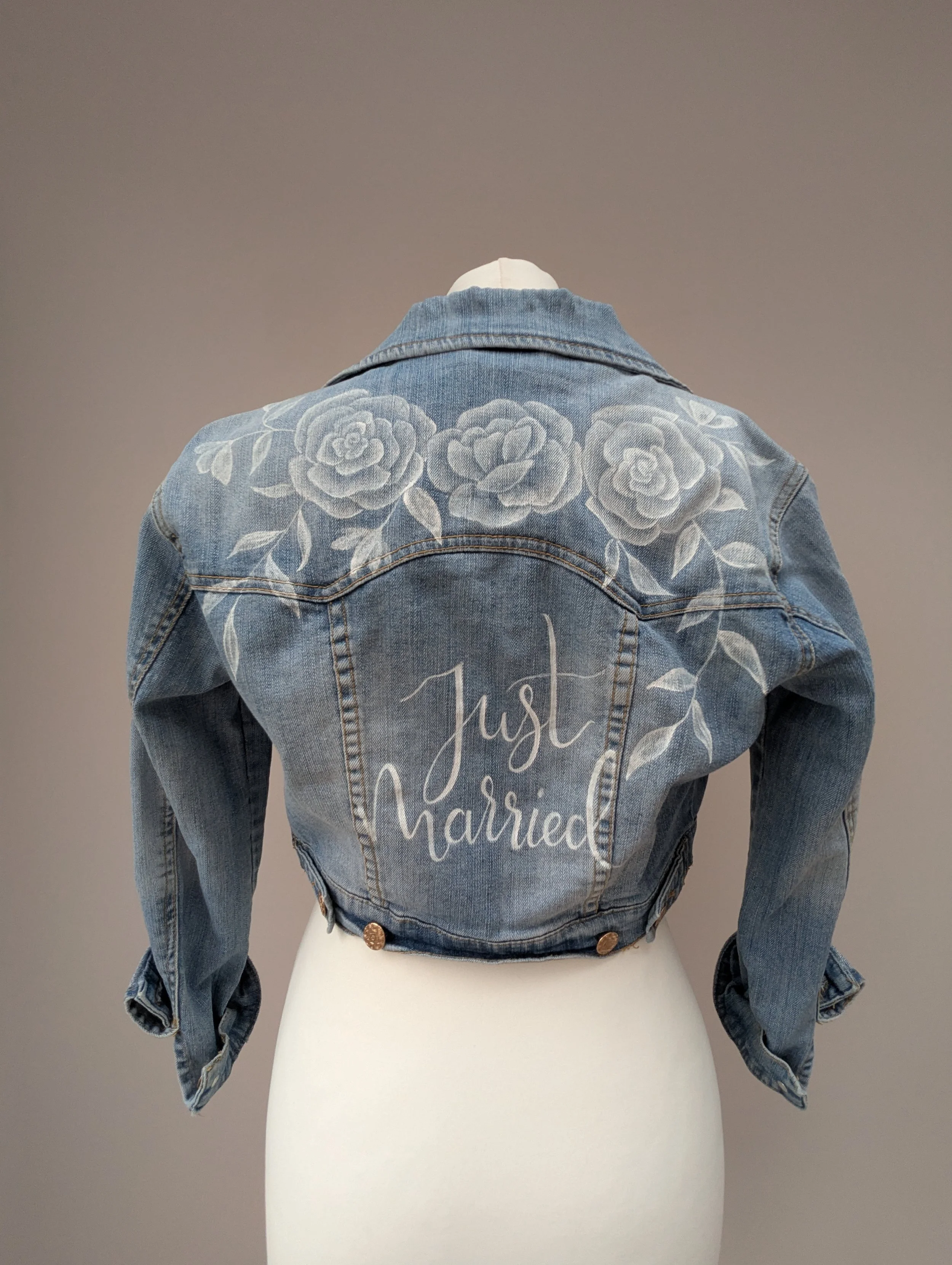 Add a touch of awesome to your wedding day with this Just Married hand-painted Black faux leather jacket with skulls and rose design.